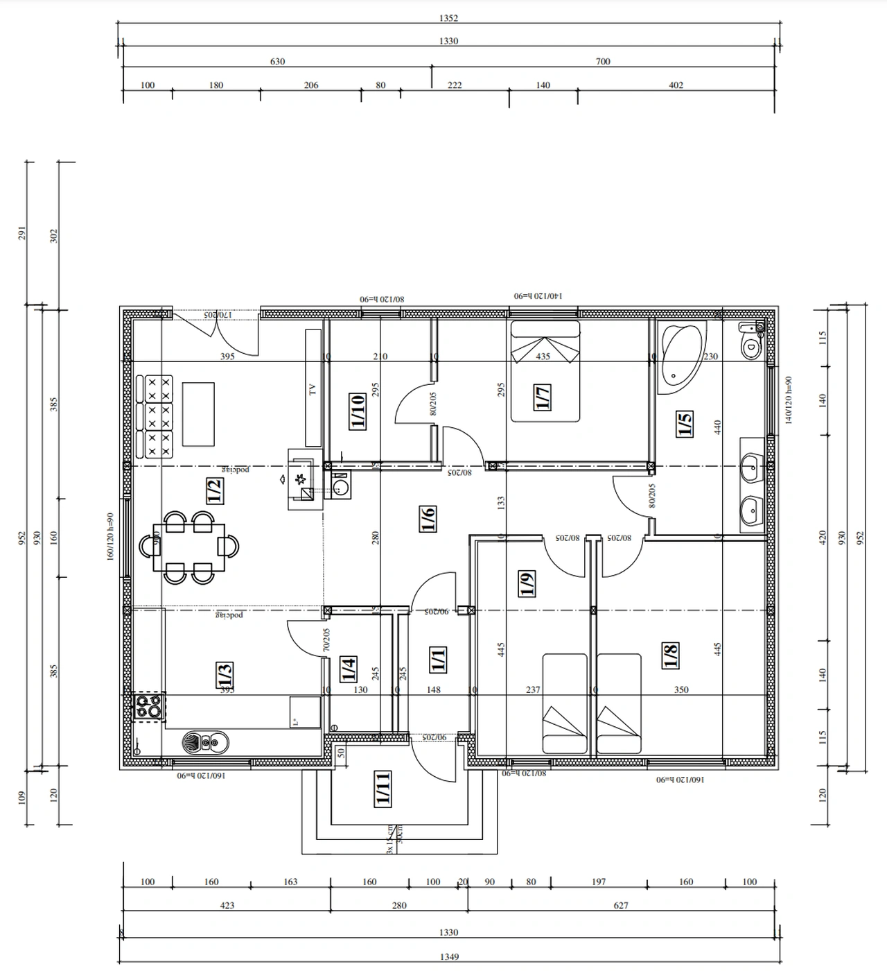Pow. zabudowy 13,3 x 9,3 m = 123,69 m²